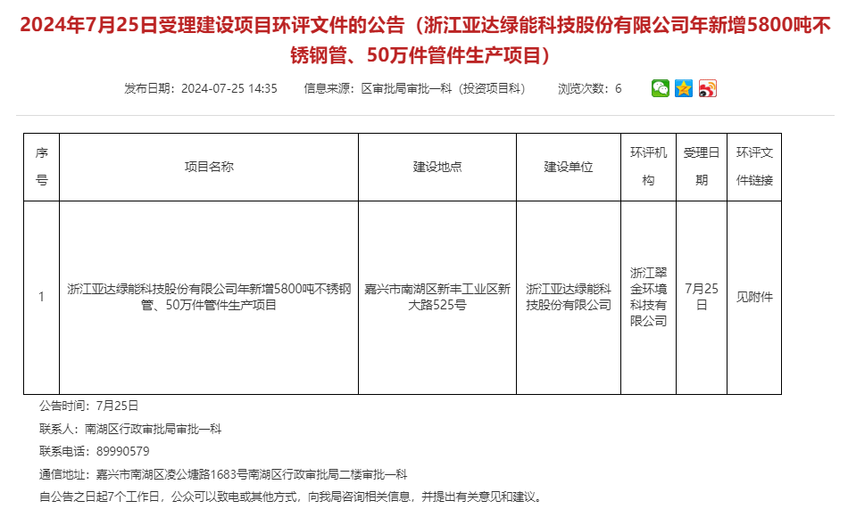 7月25日,浙江亞達綠能科技股份有限公司年新增5800噸不銹鋼管、50萬件管件生產項目環評文件獲受理,公告期:7個工作日。
